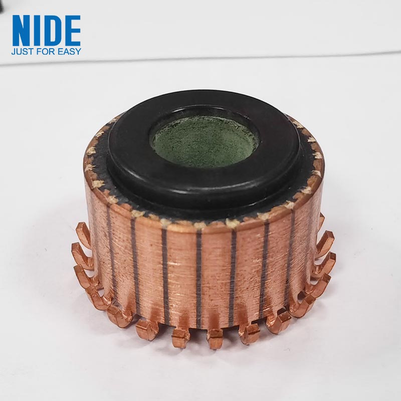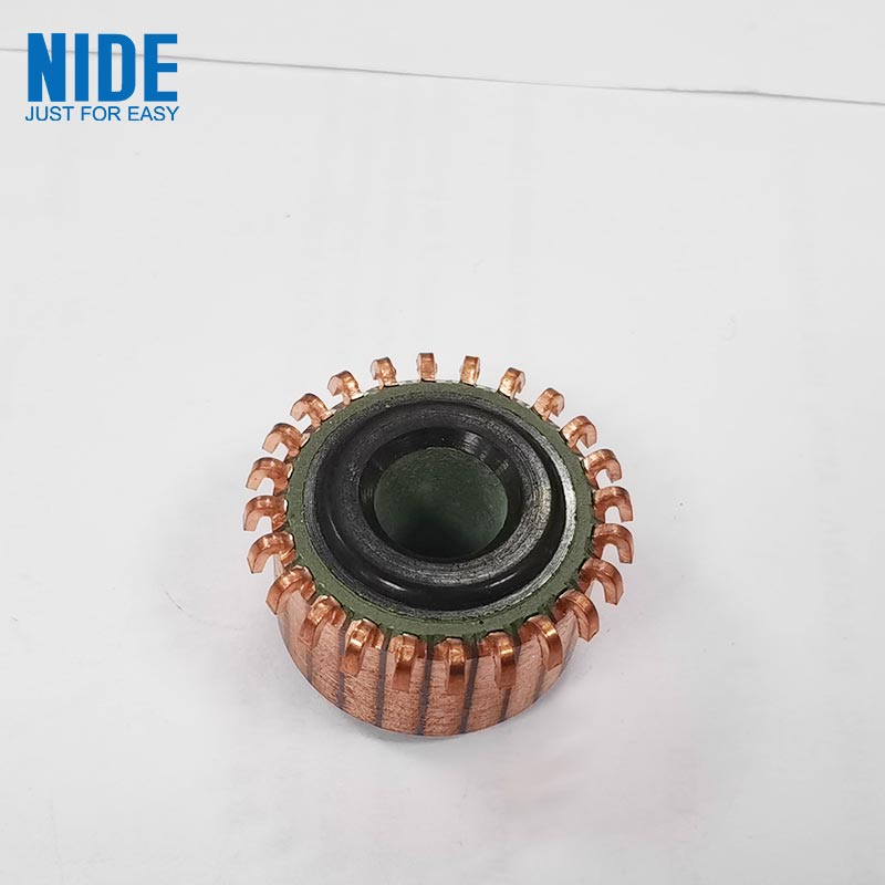 The angle grinder commutator is widely used in household motors and power tools. The basic structure of the commutator is: including commutator copper pieces evenly distributed on the outer circumference of the commutator body. The commutator bodies are injection-molded together, and the commutator copper sheets are provided with fins which are implanted into the commutator body and firmly combined with the commutator body.